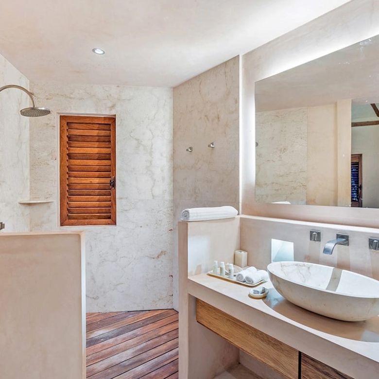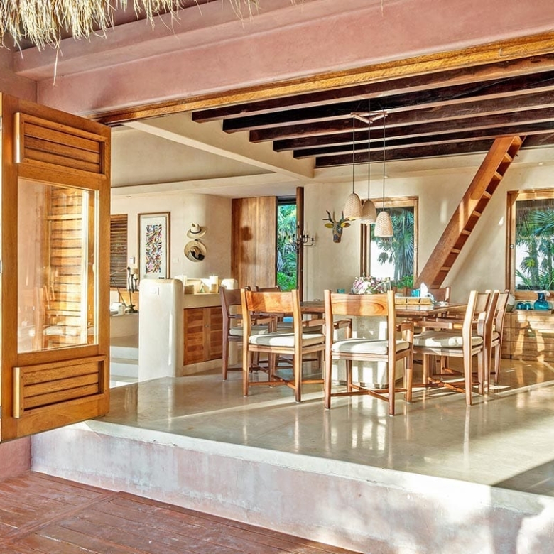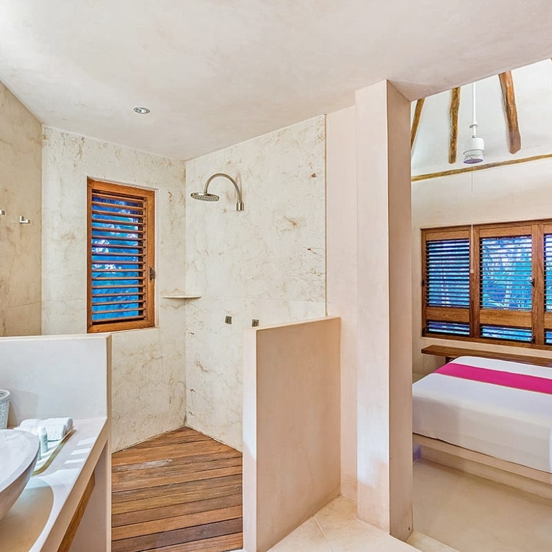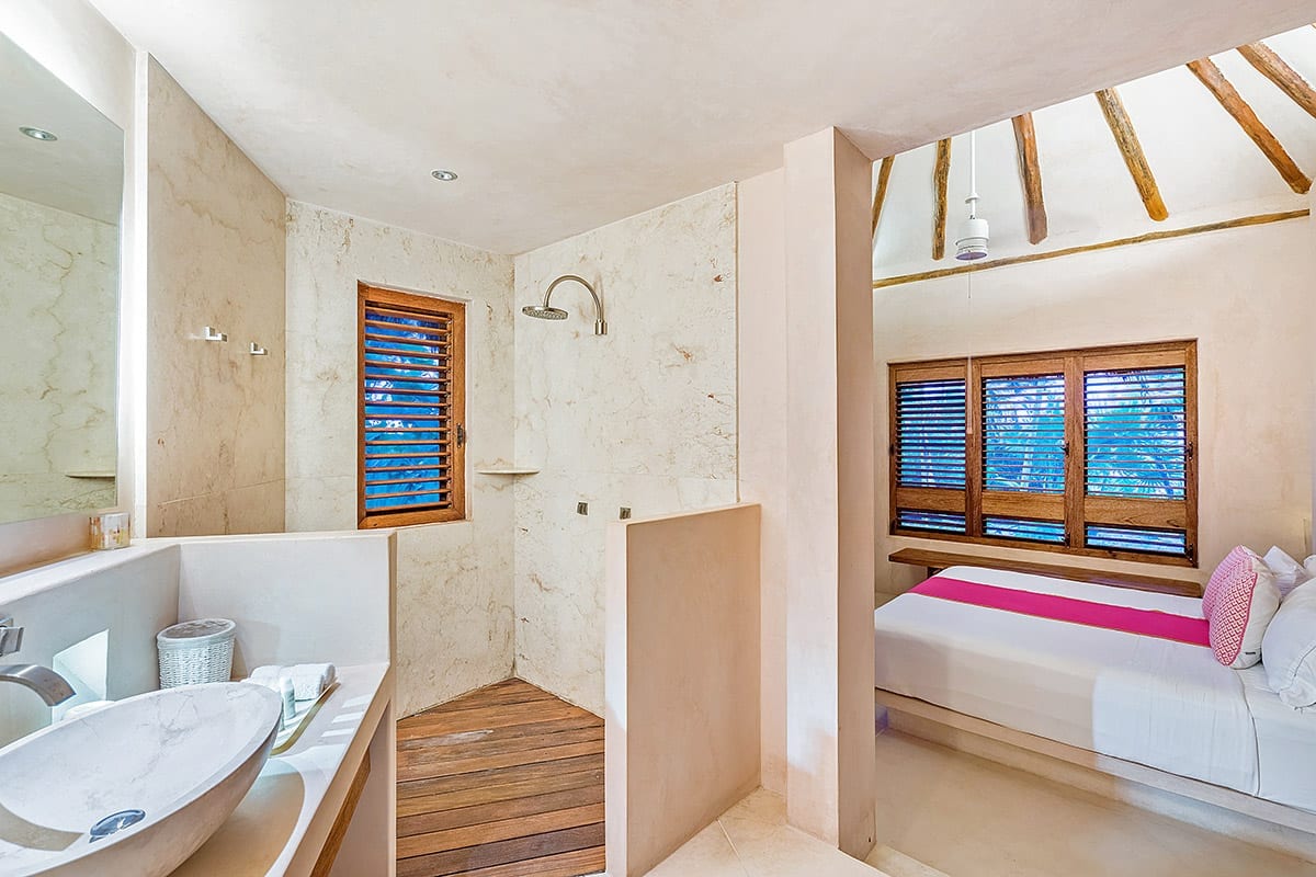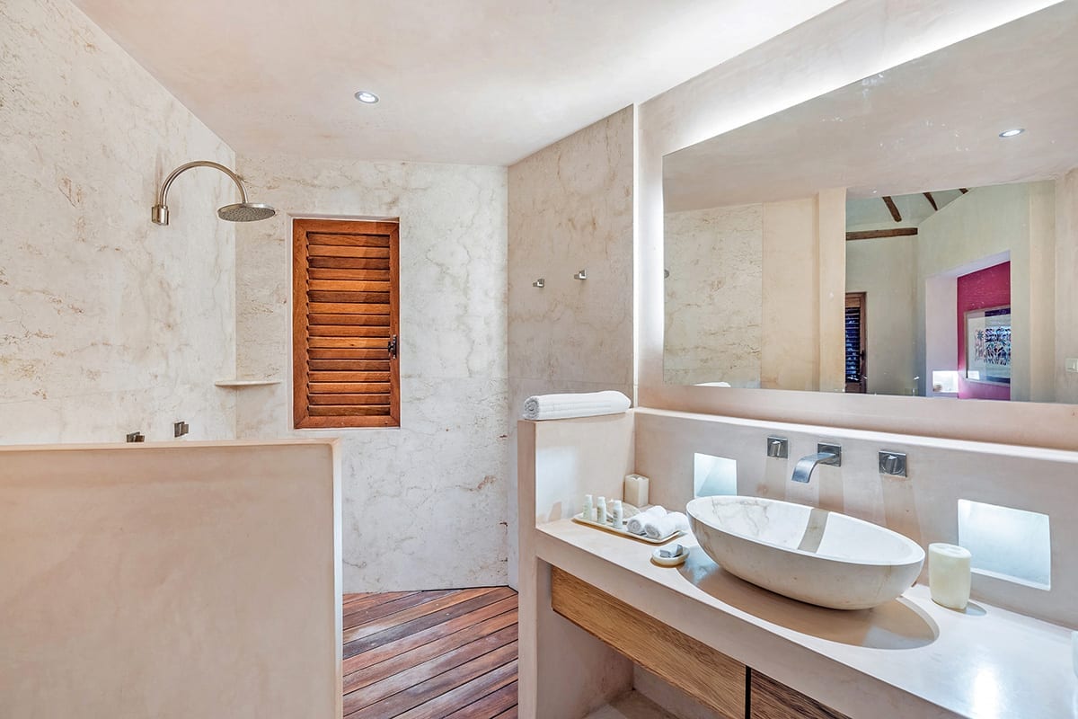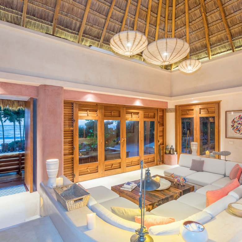 Inside, Cantarena showcases a captivating blend of exotic elegance and contemporary sophistication. Infused with Mayan influences, the interiors boast spacious layouts and high-end furnishings. The airy great room features exposed beams and thatched vaulted ceilings, adorned with romantic lanterns and indigenous accents. Polished stone, playful pink columns, and soft pastel tones create a welcoming ambiance, perfect for gatherings or quiet relaxation. The sitting area, furnished with low-slung white sectionals, invites guests to enjoy morning coffee while admiring the panoramic ocean views. Four suite-style bedrooms, adorned in soothing shades of sand and turquoise, ensure utmost comfort and luxury. Stone-clad showers and wooden accents add a spa-like touch to the bathrooms.