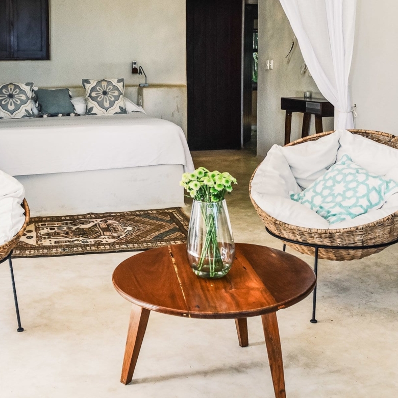 Inside, a fusion of jungle exoticism and contemporary refinement awaits, with designer furnishings complementing the organic essence of the surroundings. Whitewashed interiors, adorned with local textiles and patterns, exude artisanal charm, offering a haven of tranquility and uniqueness.