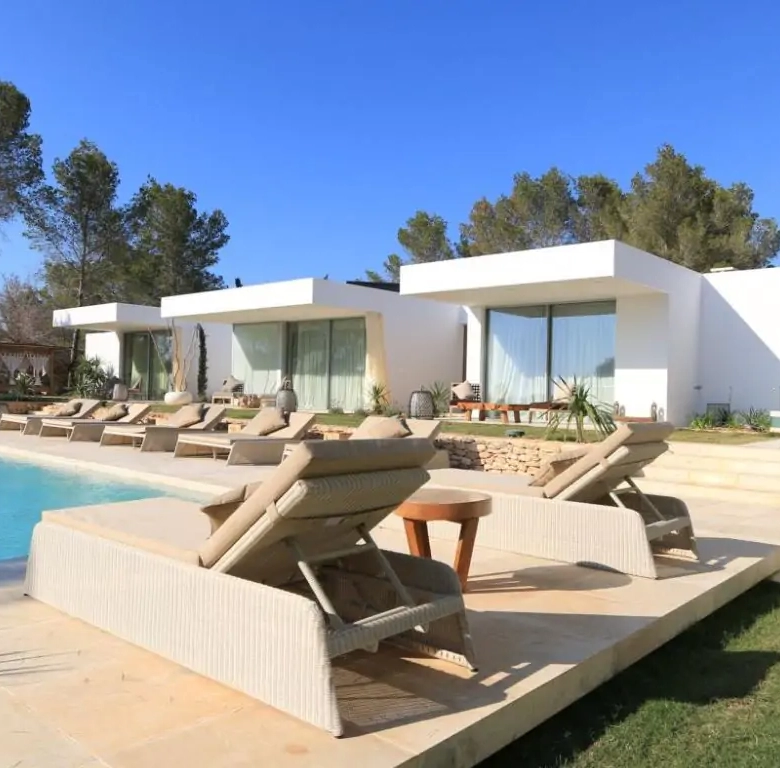 Outside, Villa Can Benimussa offers plenty of shaded areas, perfect for enjoying a refreshing cocktail amidst tranquil surroundings. Guests can indulge in alfresco dining in the garden, creating an ambiance reminiscent of exclusive beach clubs. The serene exteriors feature a stunning infinity pool, providing the ultimate escape from the afternoon heat, while outdoor lounges offer a perfect spot for nighttime relaxation under the mesmerizing starlit sky.