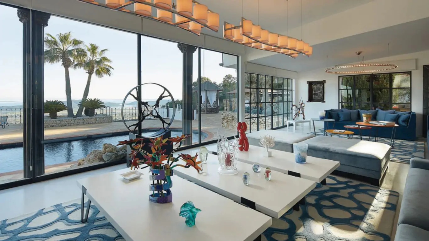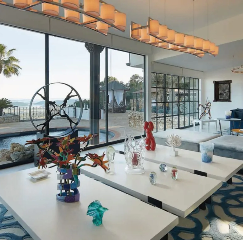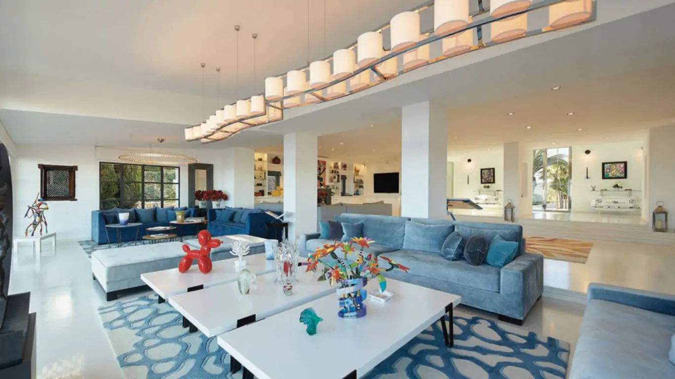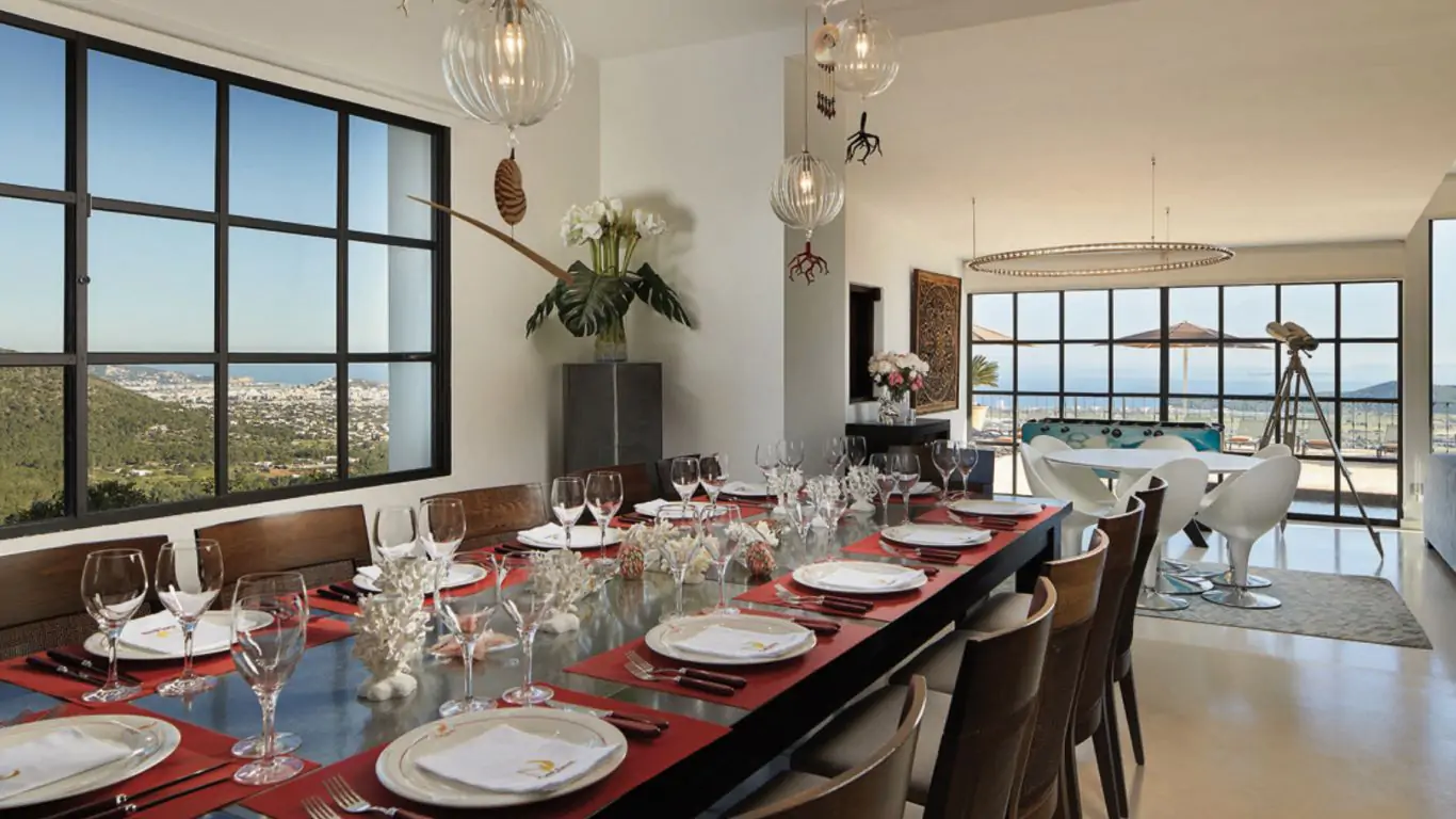Sleek lines and crisp vertices sculpt a prestigious gallery-like ambiance supplanted with shimmering precious stone flooring and scintillating metal accents. An innovative and cavernous architecture with 20′ ceilings offers the ultimate canvas for various interactive installation pieces, placing the postmodern creative impulse front row center. Vaulted high ceilings create light and airy spaces throughout three fantastic entertaining areas, where every room allows the golden hues of the sunlight to shine through- providing a warm and calming vibe. Featuring chic lounge furniture, a professionally equipped kitchen, wine cellars, and modern office equipment, Villa Eliza’s full range of amenities is masterfully designed to offer ultimate comfort. Ideal for friends and families alike, this revered Ibizan luxury vacation home can comfortably accommodate 14 people between seven sumptuous bedrooms and seven bathrooms.