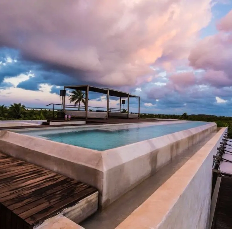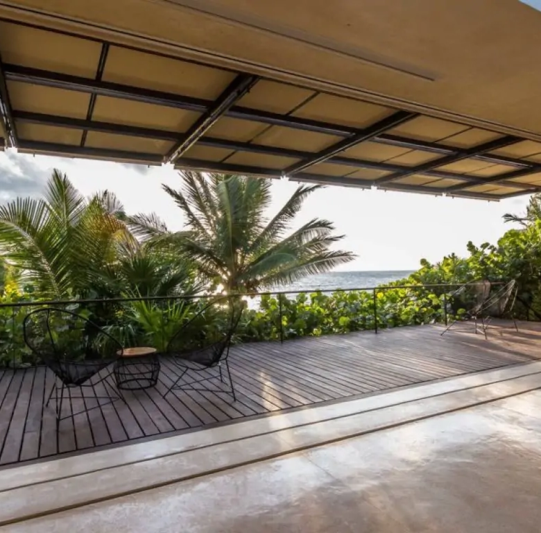 Outside, resort-style grounds beckon with a private sandy stretch adorned with day beds and water toys for exploring the crystalline waters and local reef. Relax in the shade of the coconut palm lounge or unwind in a handcrafted Merida hammock. A stunning 65-foot lap pool graces the rooftop terrace, providing unparalleled refreshment amidst a panorama of palm trees and endless sea vistas.