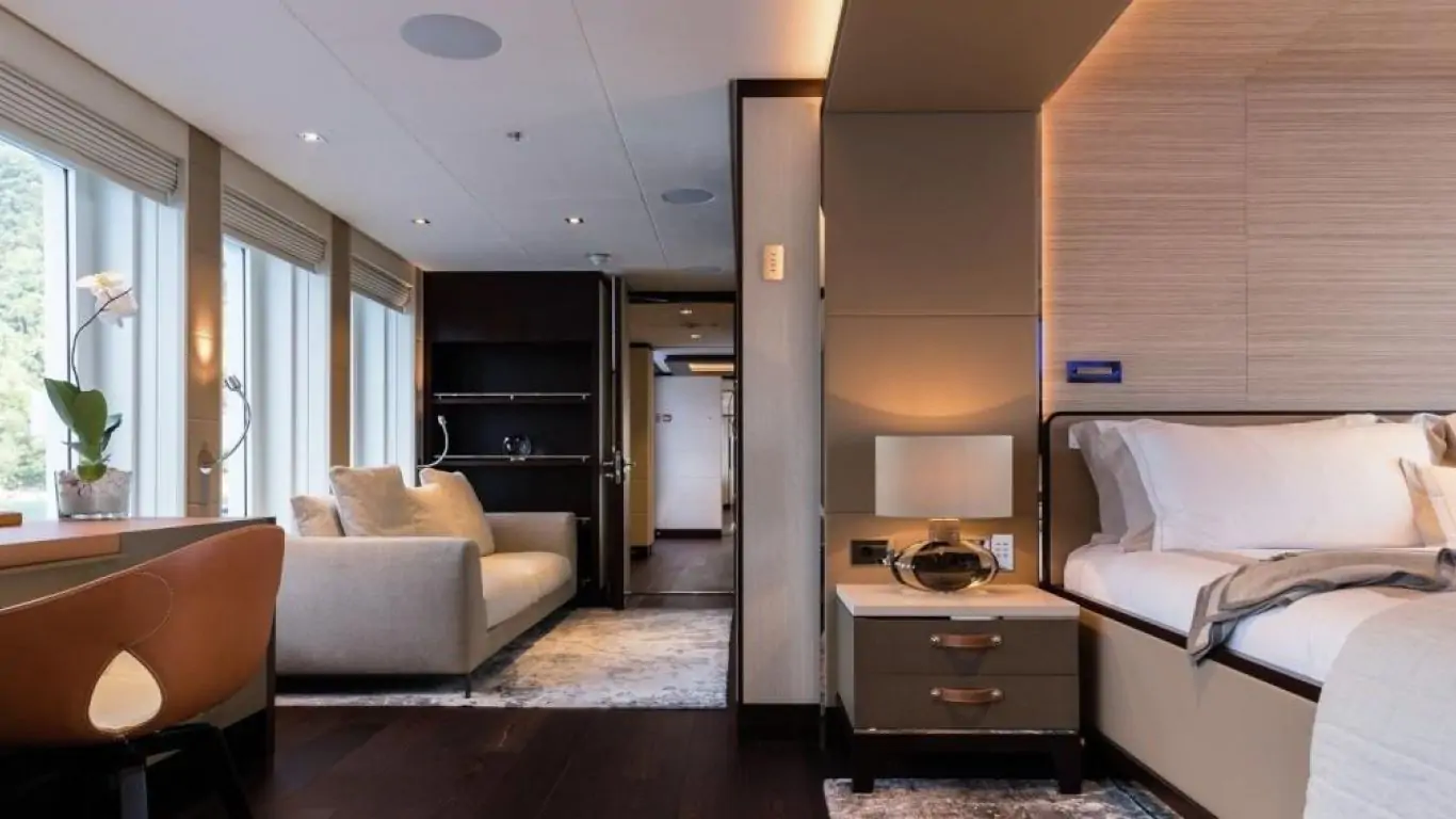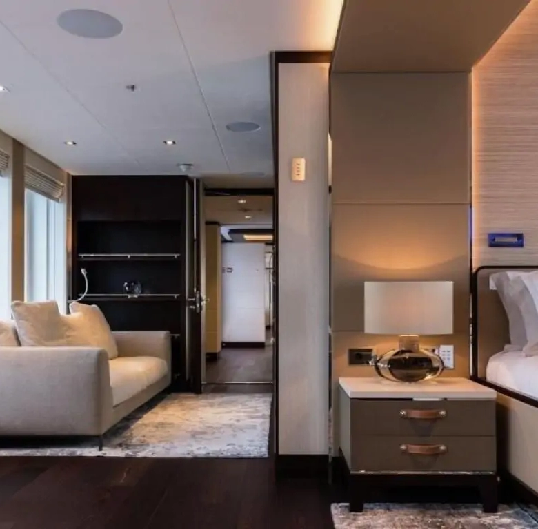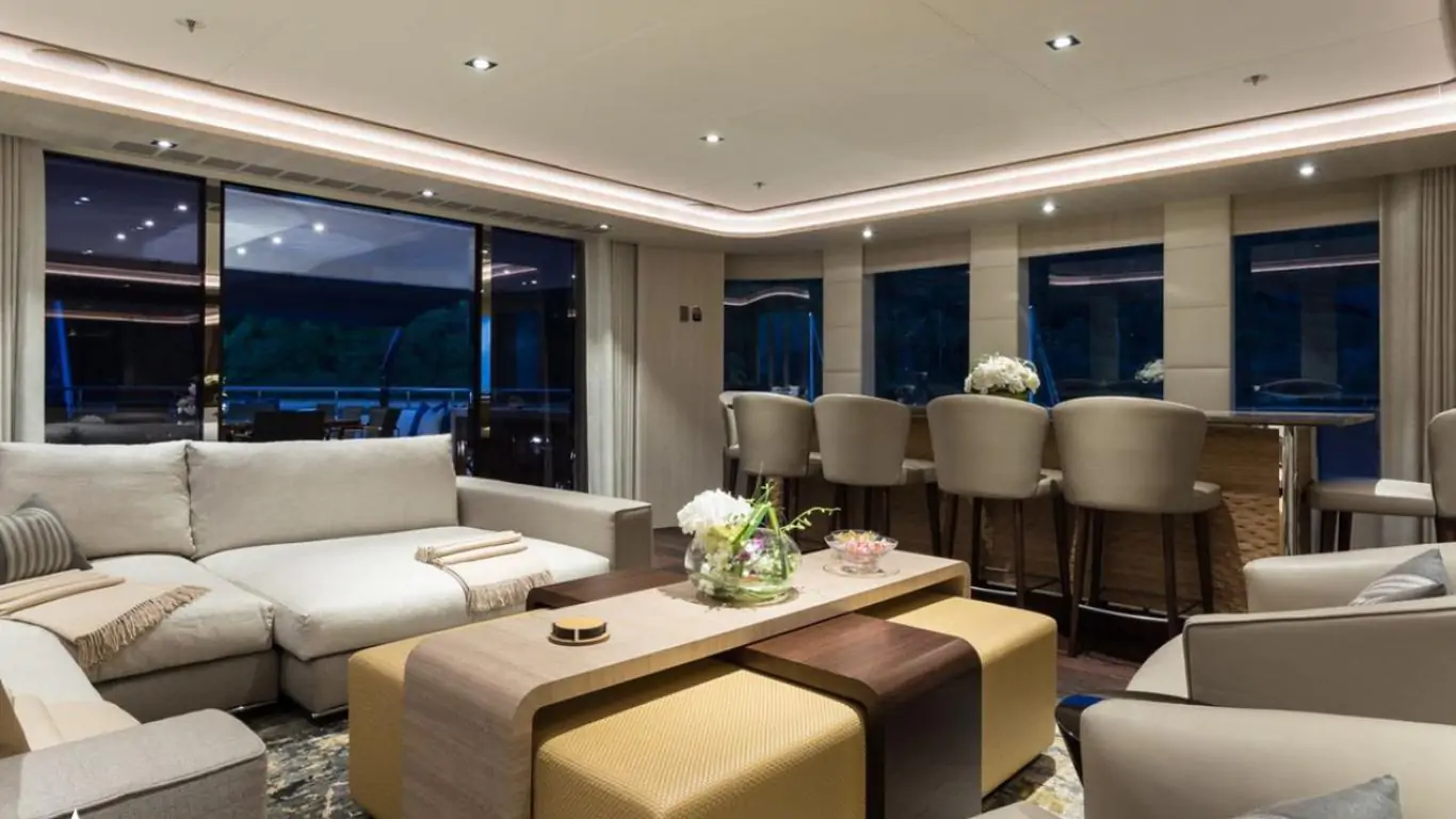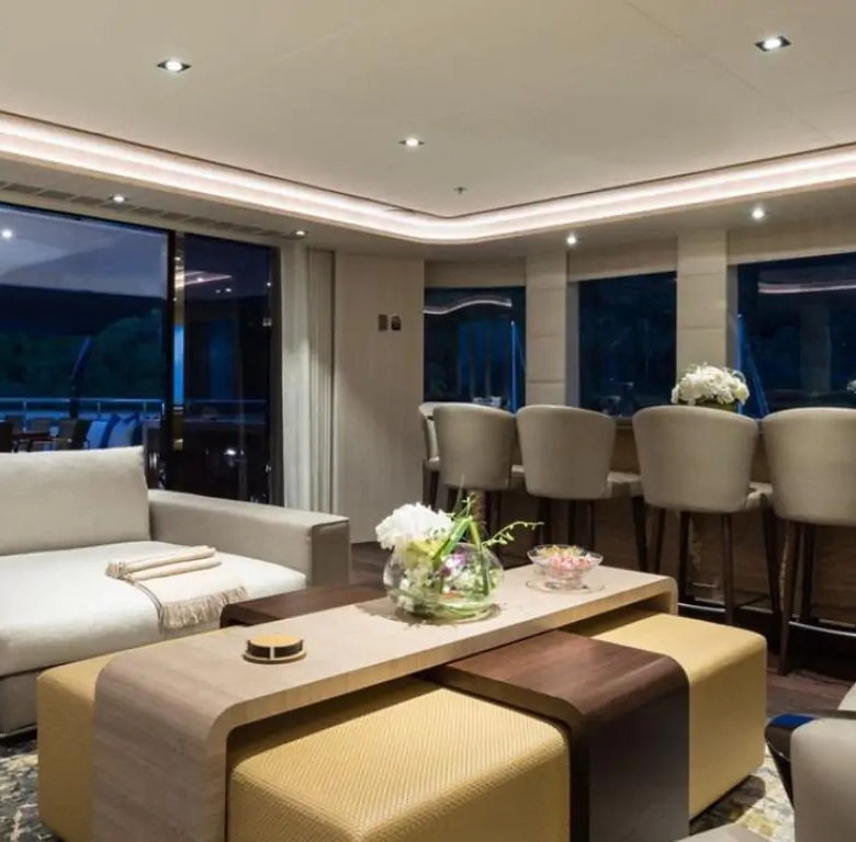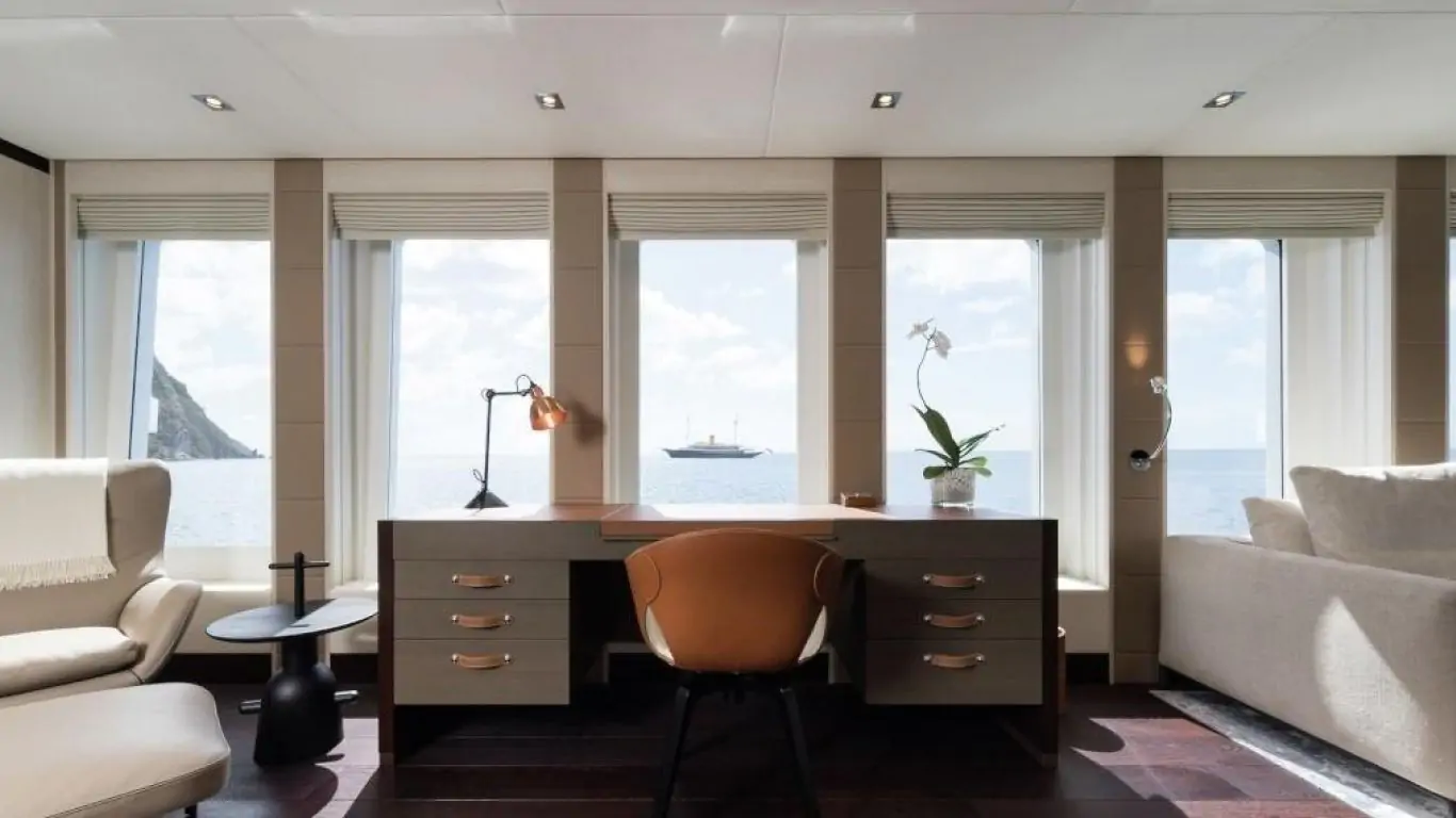 The interiors are a testament to timeless luxury and refined aesthetics. Imbued with enduring sophistication, the design features sumptuous seating arrangements and exquisite furnishings that seamlessly blend to create an atmosphere of unparalleled elegance. The use of premium materials and meticulous craftsmanship enhances the overall ambiance, ensuring a sense of opulence and comfort. Accommodating up to 12 guests in six rooms, including a master suite, VIP stateroom, two double cabins, two twin cabins, and two Pullman beds, Laurentia 181 ensures a comfortable retreat. The vessel also accommodates a crew of up to 13, guaranteeing a refined and relaxed yachting experience. Additional amenities, such as air conditioning, a beach club, on-deck Jacuzzi, at-anchor stabilizers, stabilizers underway, and onboard WiFi, contribute to an enhanced onboard experience.